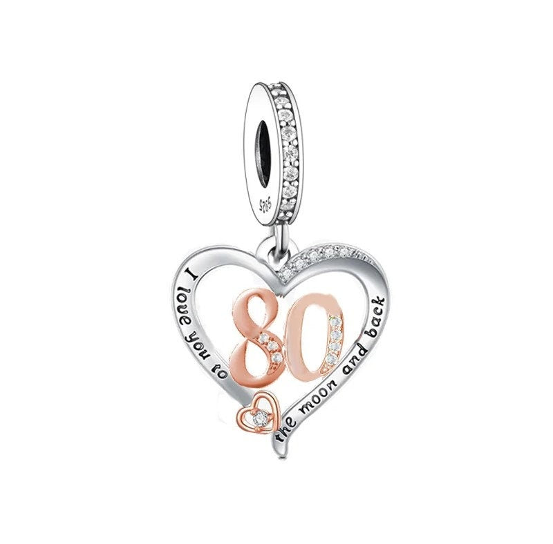 80th Birthday Celebration, 925 Sterling Silver 80th Birthday I love you to the Moon and Back Birthday Fits all Charm Bracelets 80th gift