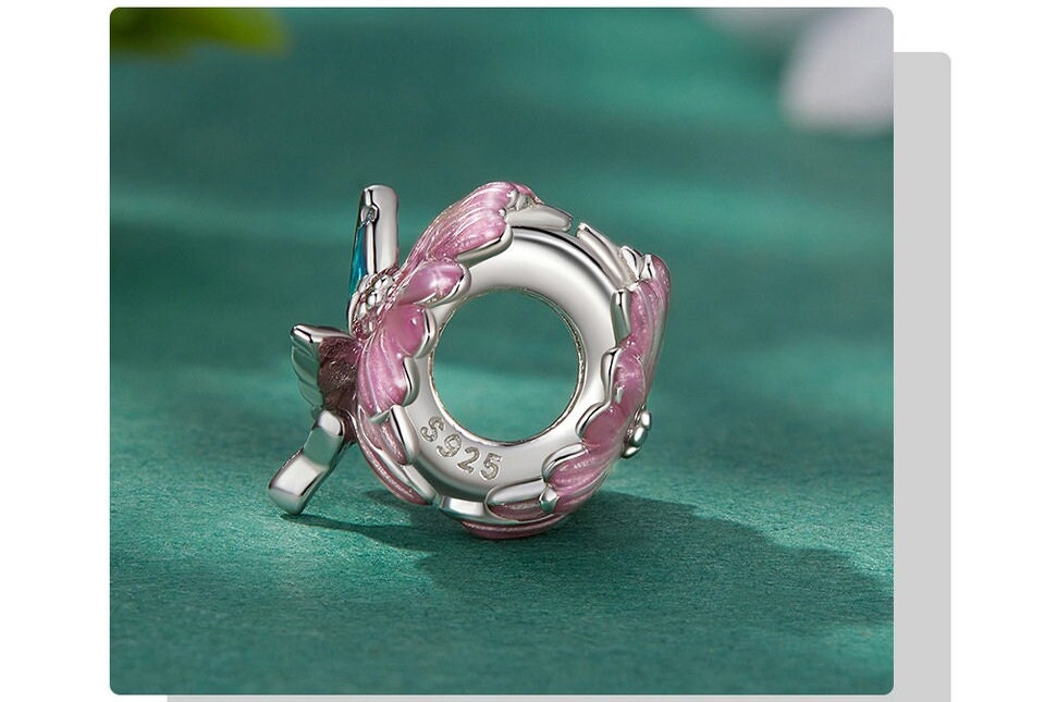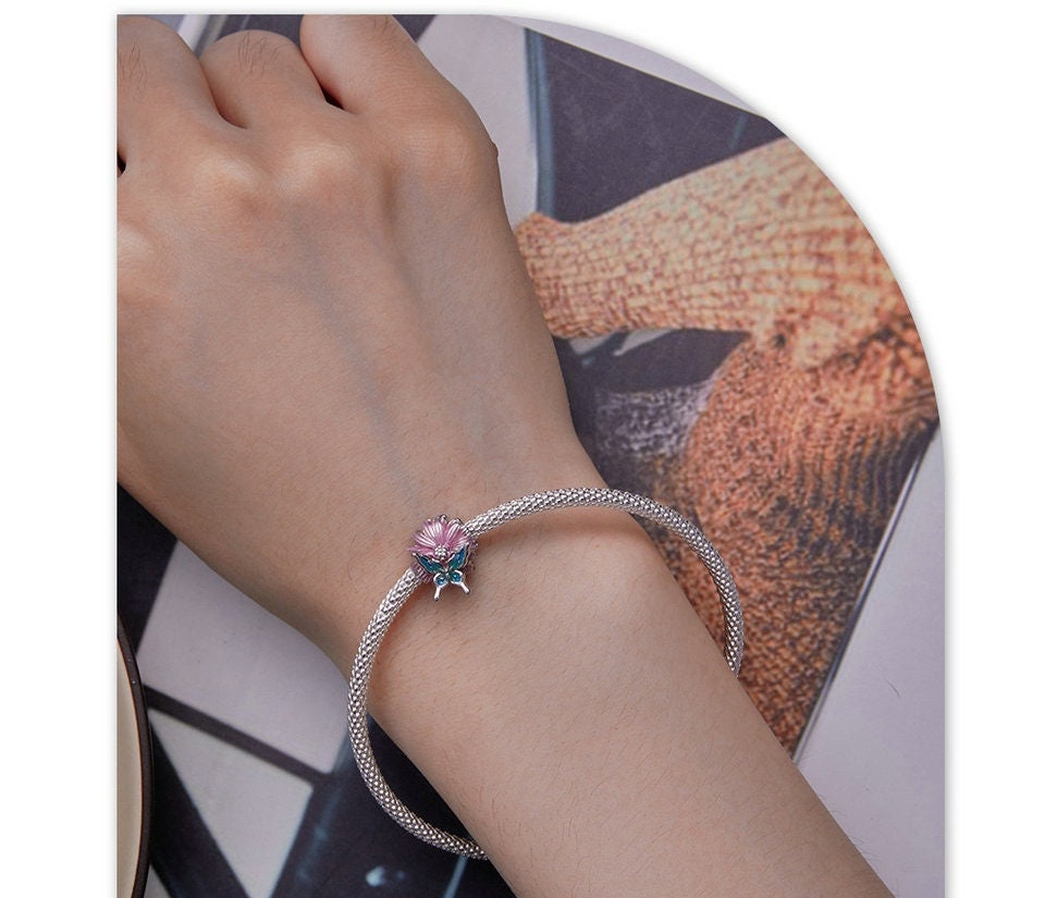 Butterfly on flower 925 Silver Charm European style Bracelet, Necklace Charm 925 Charm, Gifts for her Butterfly Charm