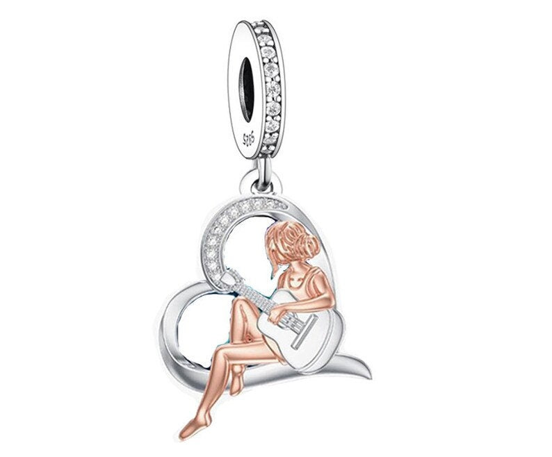 Girl playing Guitar charm ,925 Sterling Silver Music Charms 925 Silver Charm European style Bracelet , Necklace Charm, 925 Charm