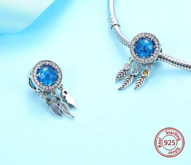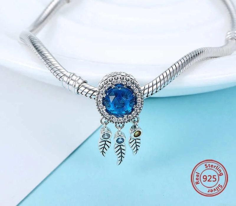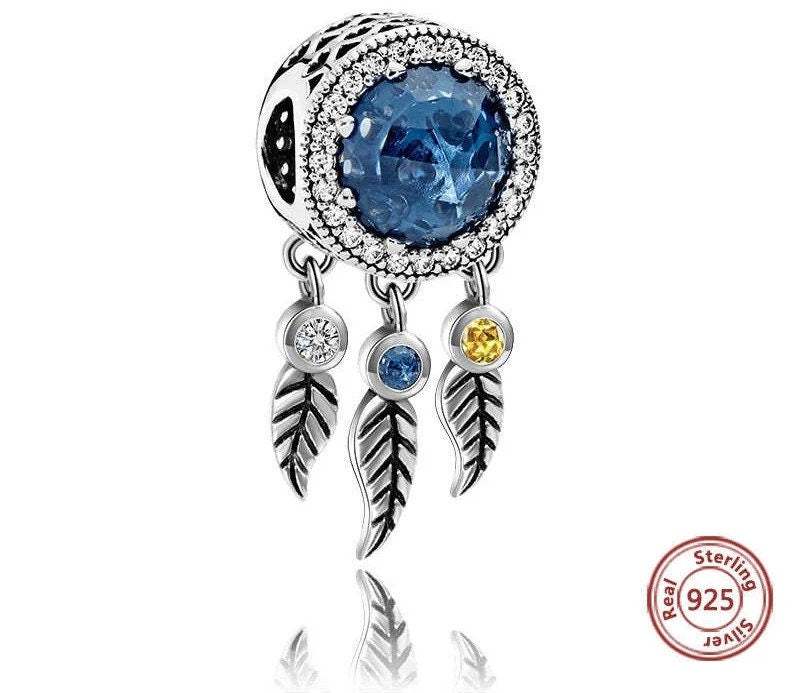 Bohemian Dream Catcher Feather Dangle Pendant Charm Sterling Silver 925 With Cubic Zirconia Charm Bracelets Dreamcatcher